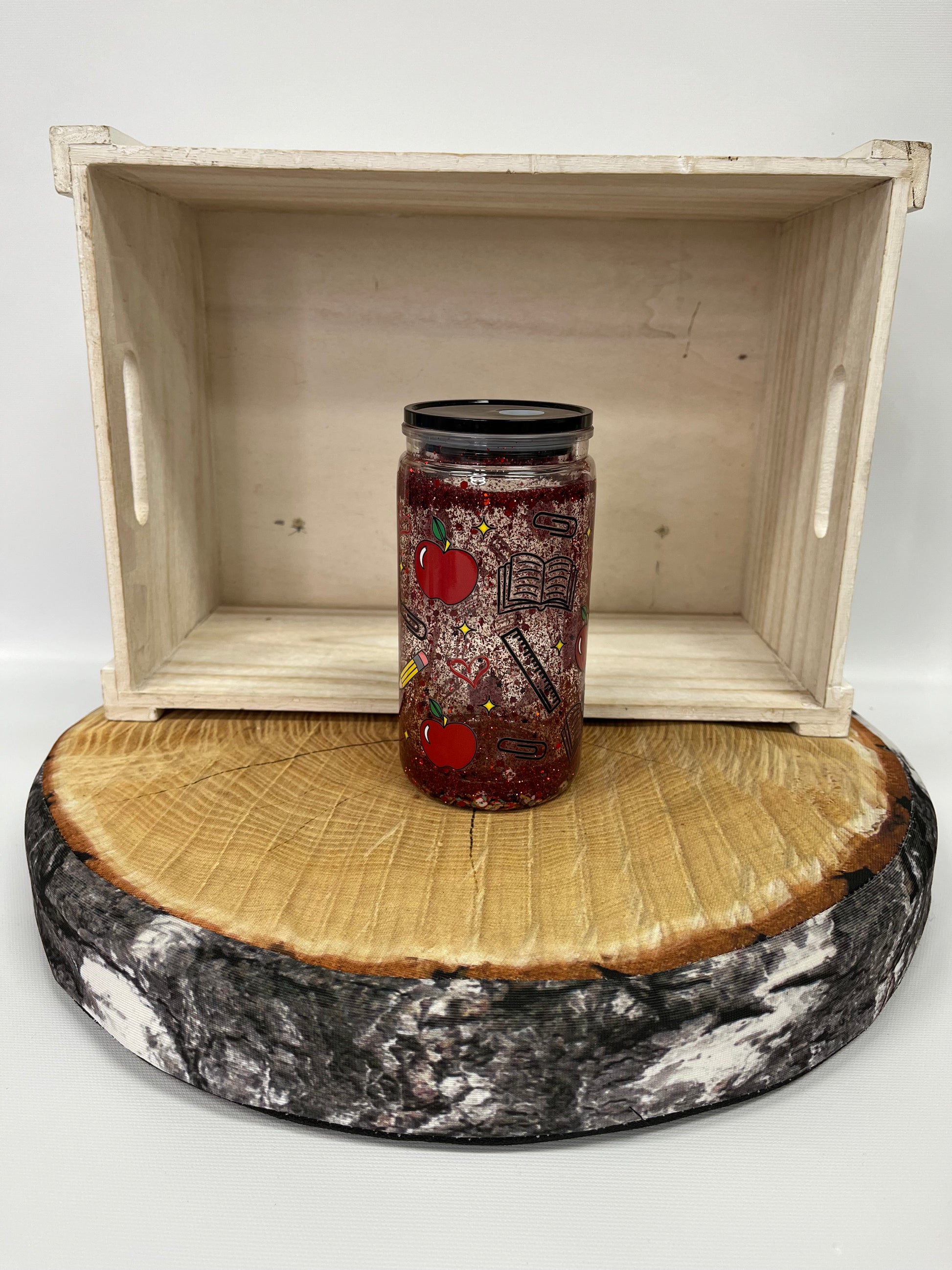 Verre en plastique à paillettes- Pomme et crayon